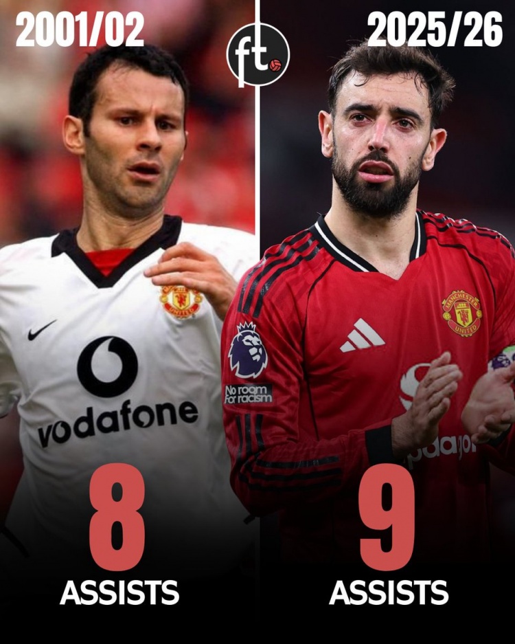 B费单比联赛季英超外场助攻球入球数9次,超越吉格斯创造曼合队史纪录